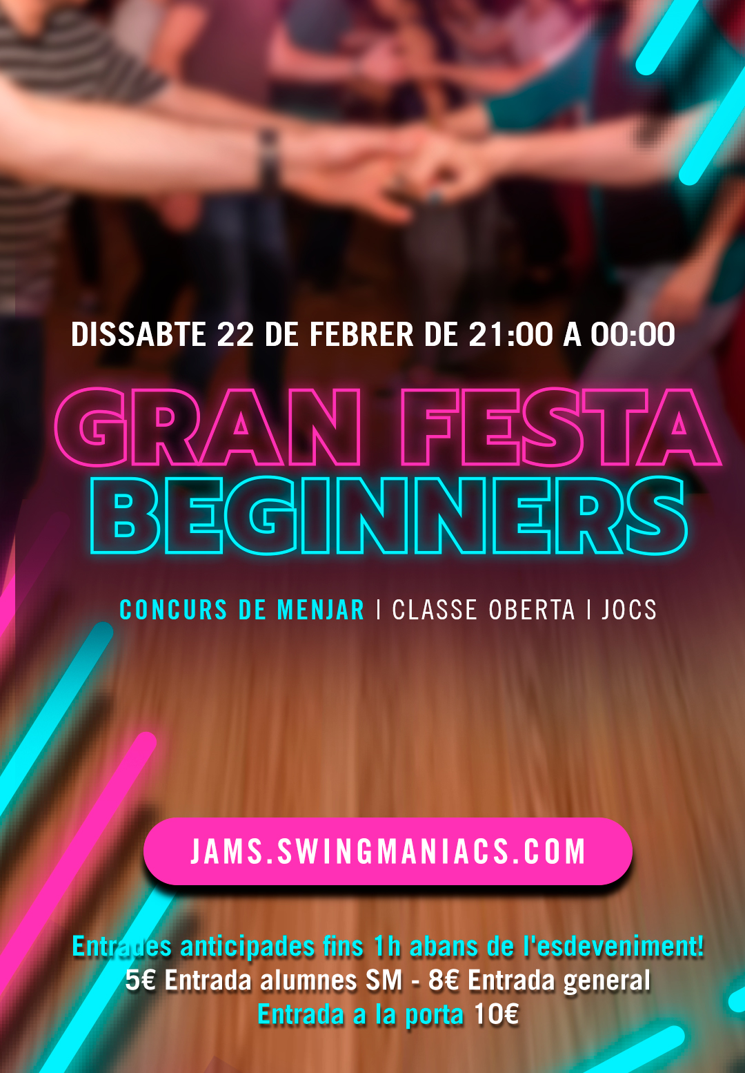 Jam de swing amb música DJ i amb classe oberta, dedicada especialment als beginners, amb concurs de menjar amb premi un curs mensual a SM i jocs! Vine a ballar!!
